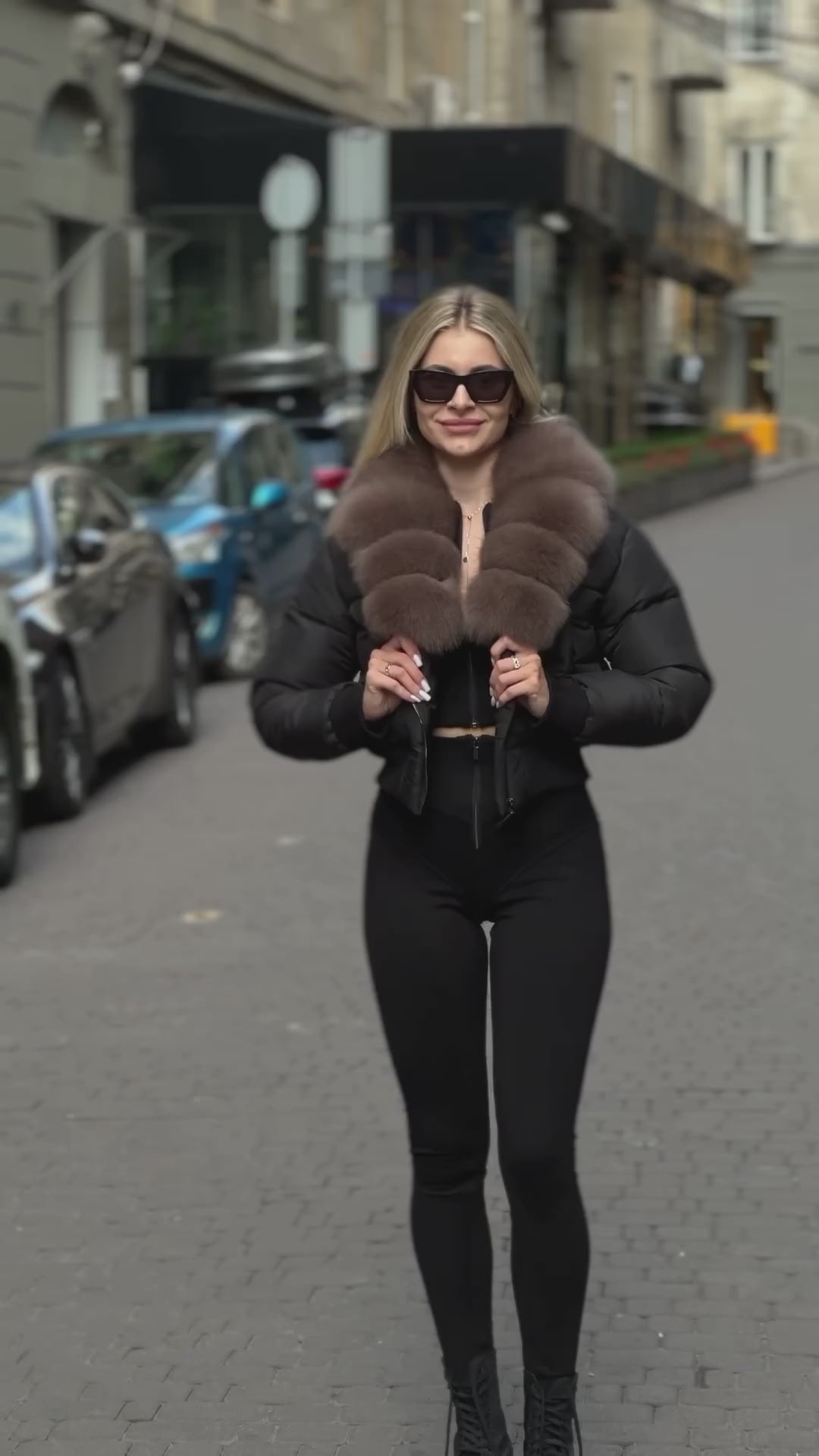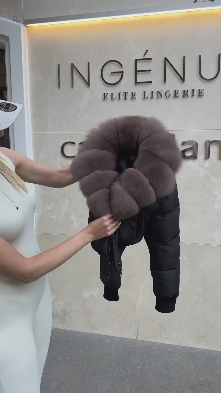 Down jacket-bomber jacket padded with real goose down, very pompous and warm for the winter season, its peculiarities: removable rounded and embossed collar in various colors in real fox fur, pockets, zip closure, cuffs and waist edge in knitted knit. Available in 4 colors.