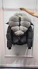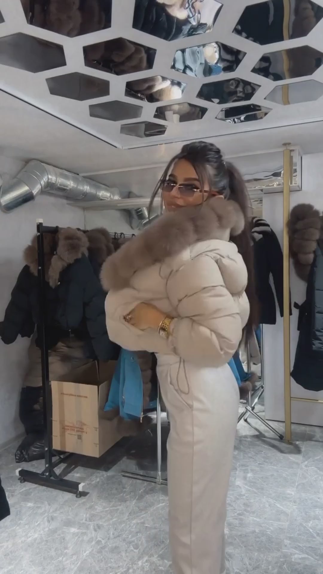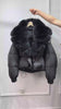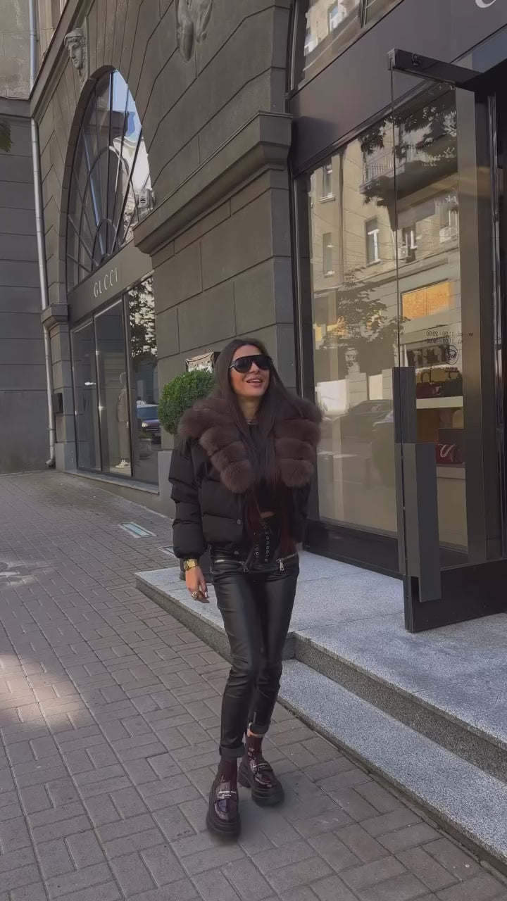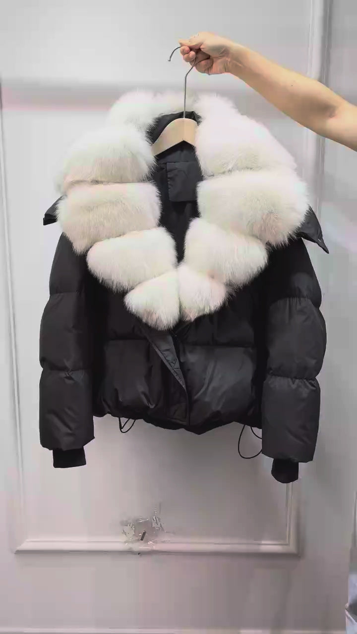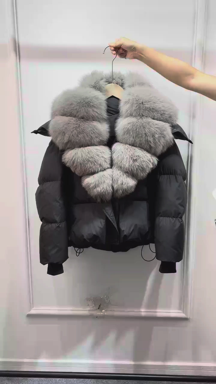 Down jacket in real goose down with pockets and zip, removable hood and fur, wide and soft collar in wavy fox hair, knitted cuffs.