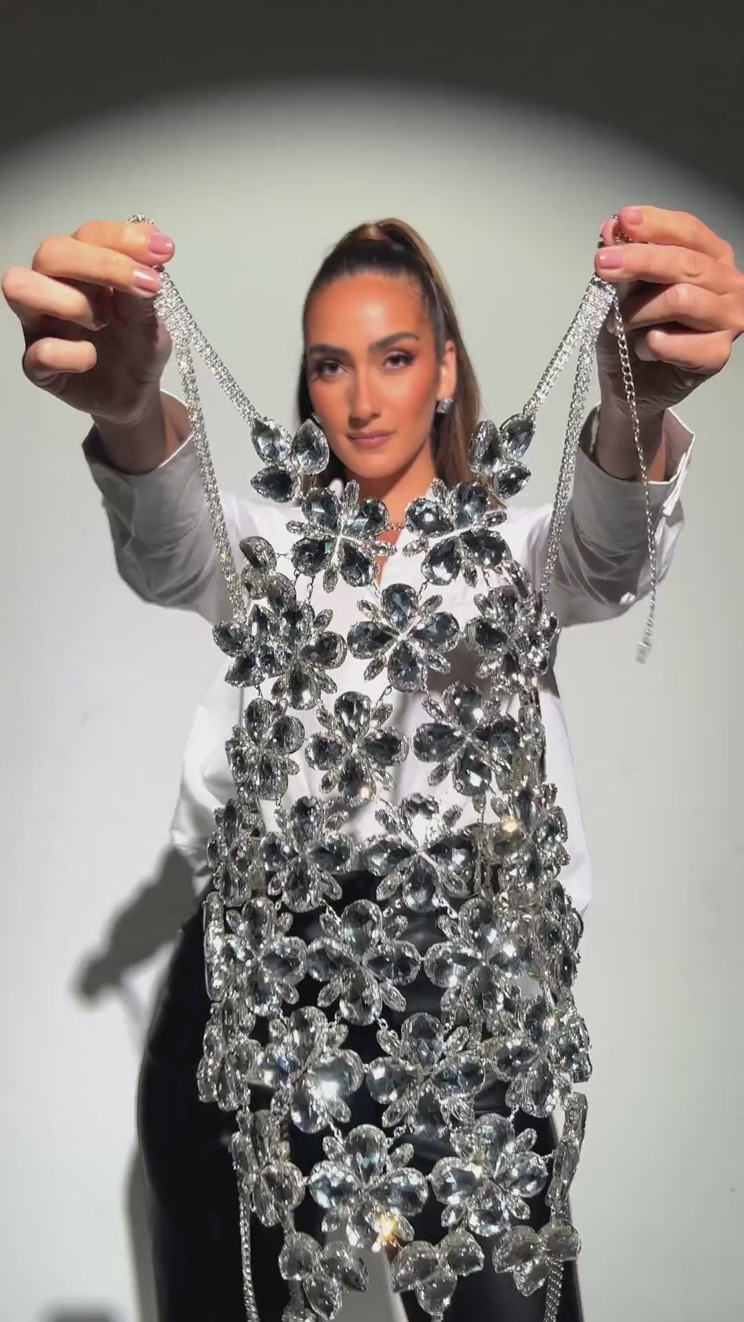 Chest jewel with large flowers in stones and rhinestones, a unique accessory that dresses and embellishes your every outfit.