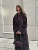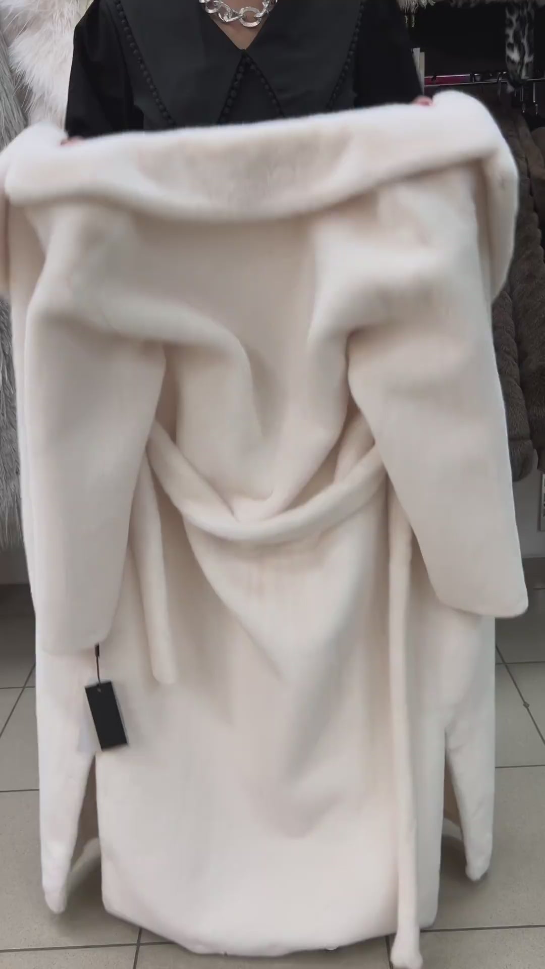 Long coat in very soft and warm stuffed animals, with belt at the waist and turned-up collar, lined.