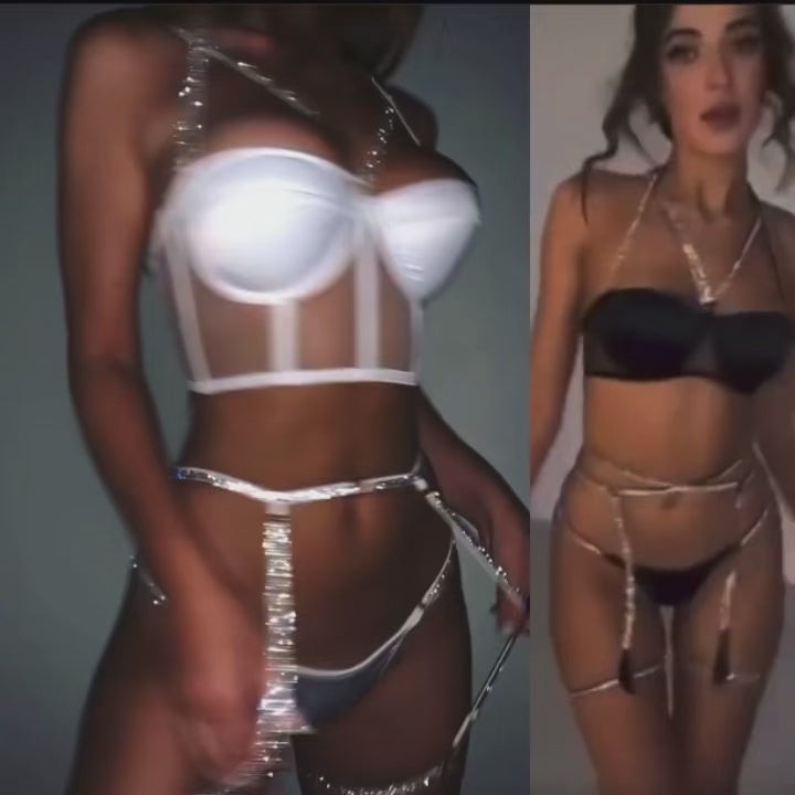 Super sexy underwear with rhinestones! Bodice top with semi-rigid cups and tulle transparencies, crossed rhinestone straps. Tanga with rhinestone profiles. Garter in matching rhinestone.