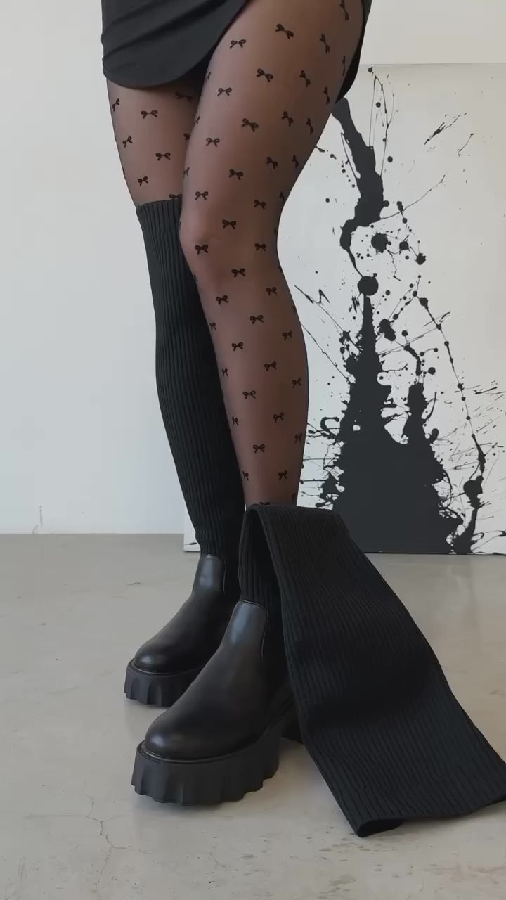 Above-the-knee high boot with stretch knit shaft, maximum comfort. Raised lug sole, side zip.