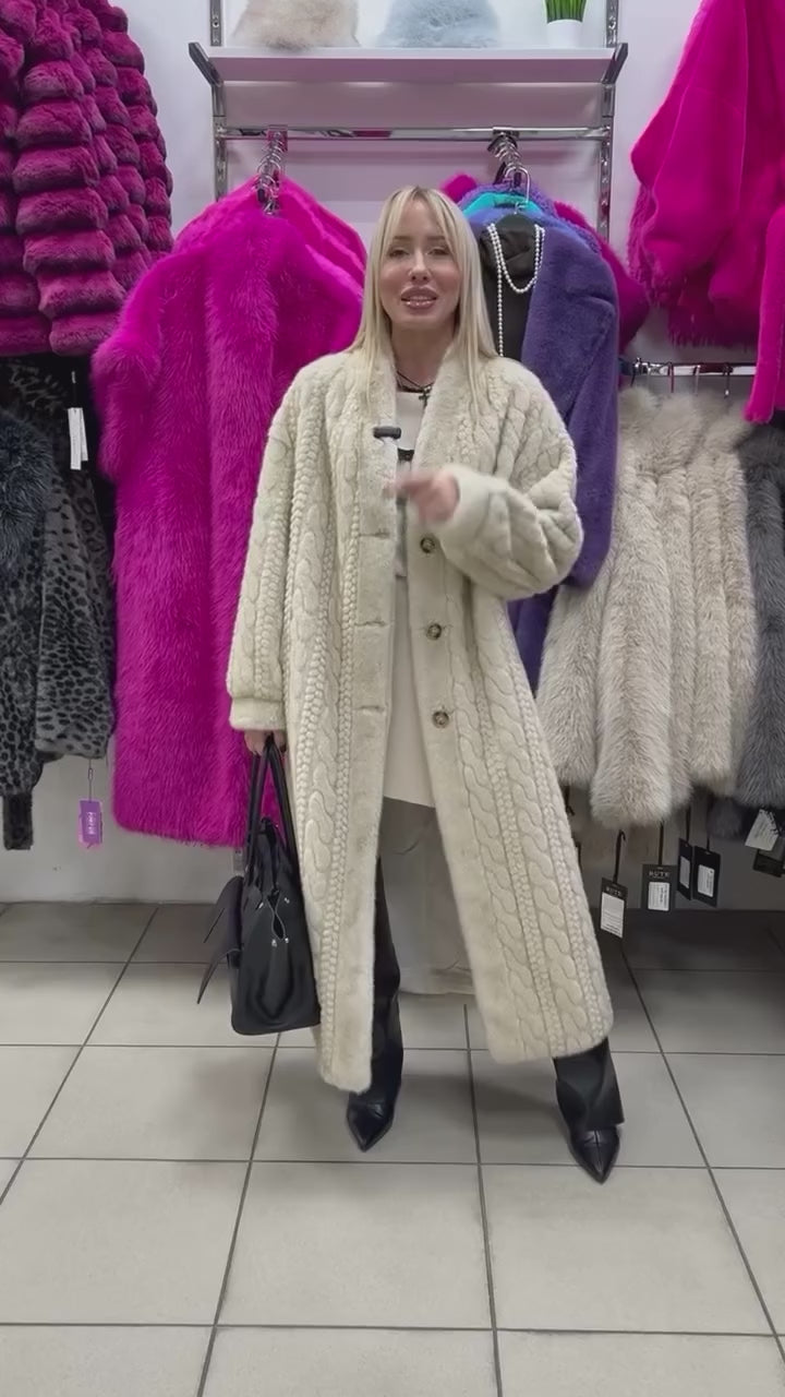 Fur coat in very soft ermine simulation faux fur. Button closure, damask motifs, cuffs and pockets.