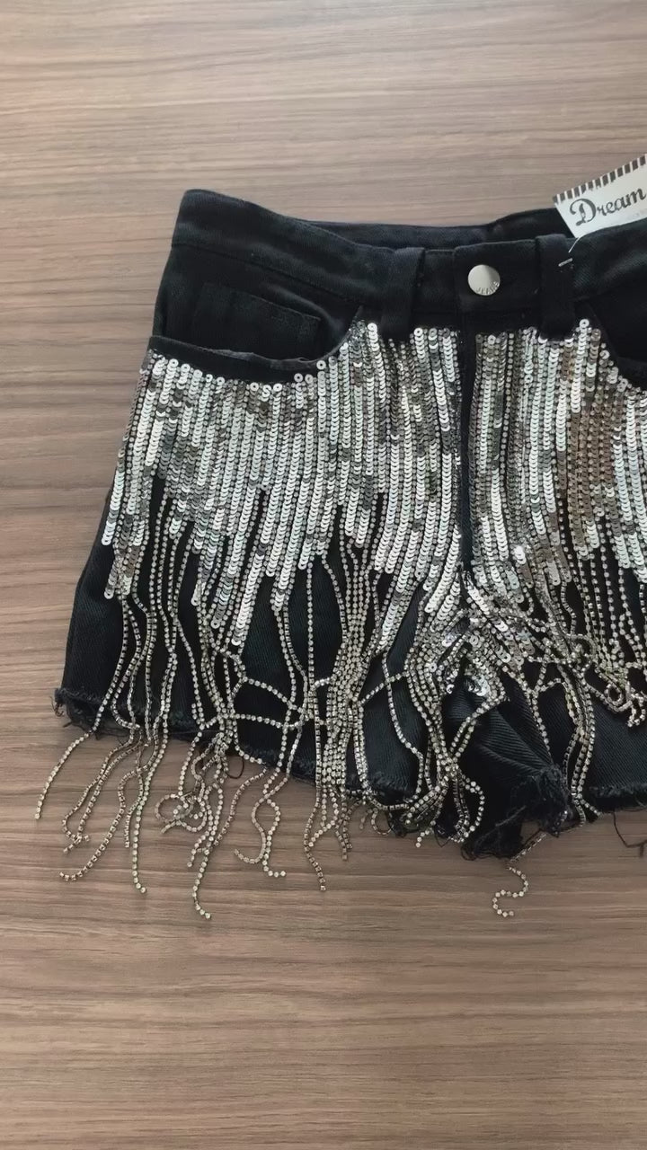 Black stretch denim shorts with rhinestone fringes and sequin appliqués. High waist.