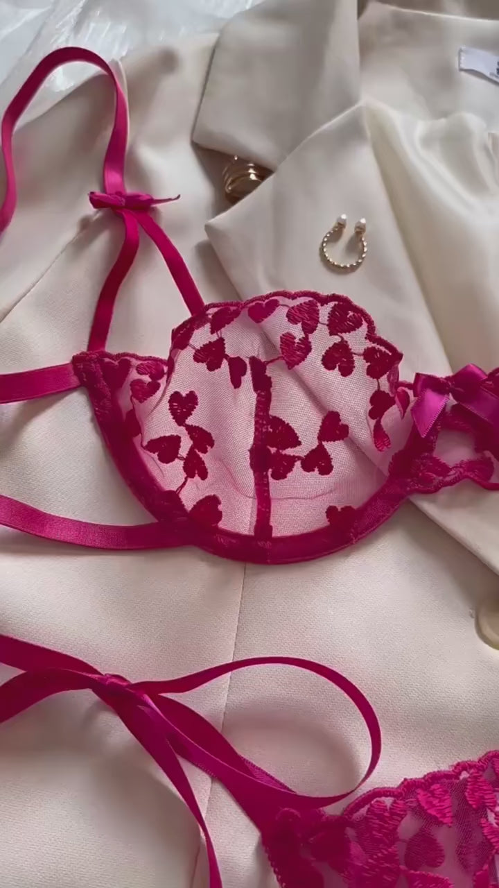 Tulle underwear set with small embroidered hearts, laces at the hips, Brazilian slib.