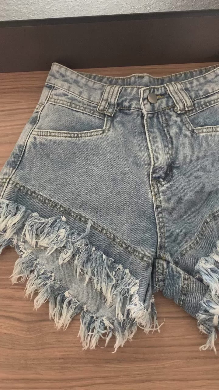 Super-fringed denim, pink or denim shorts.