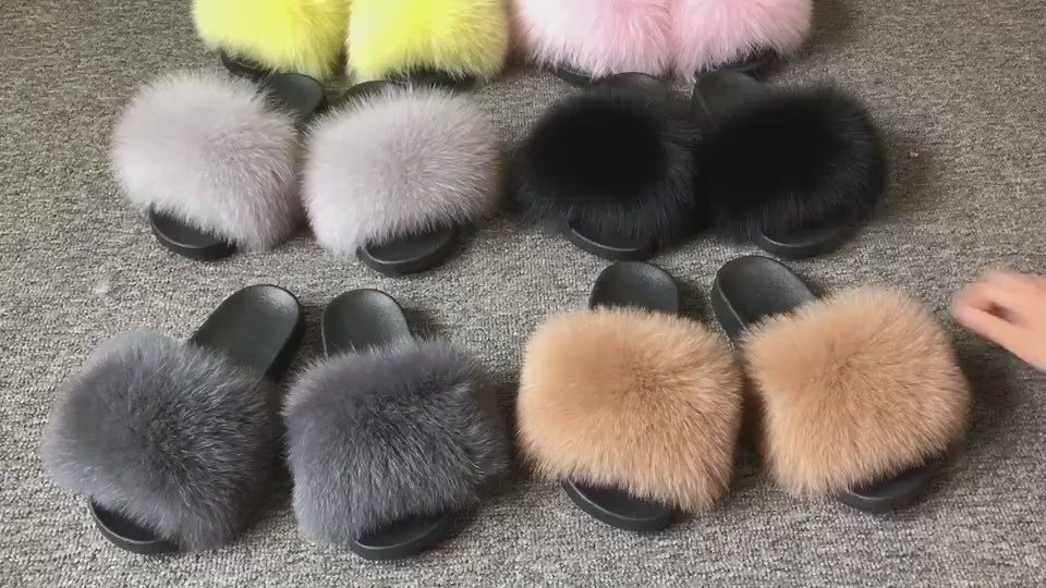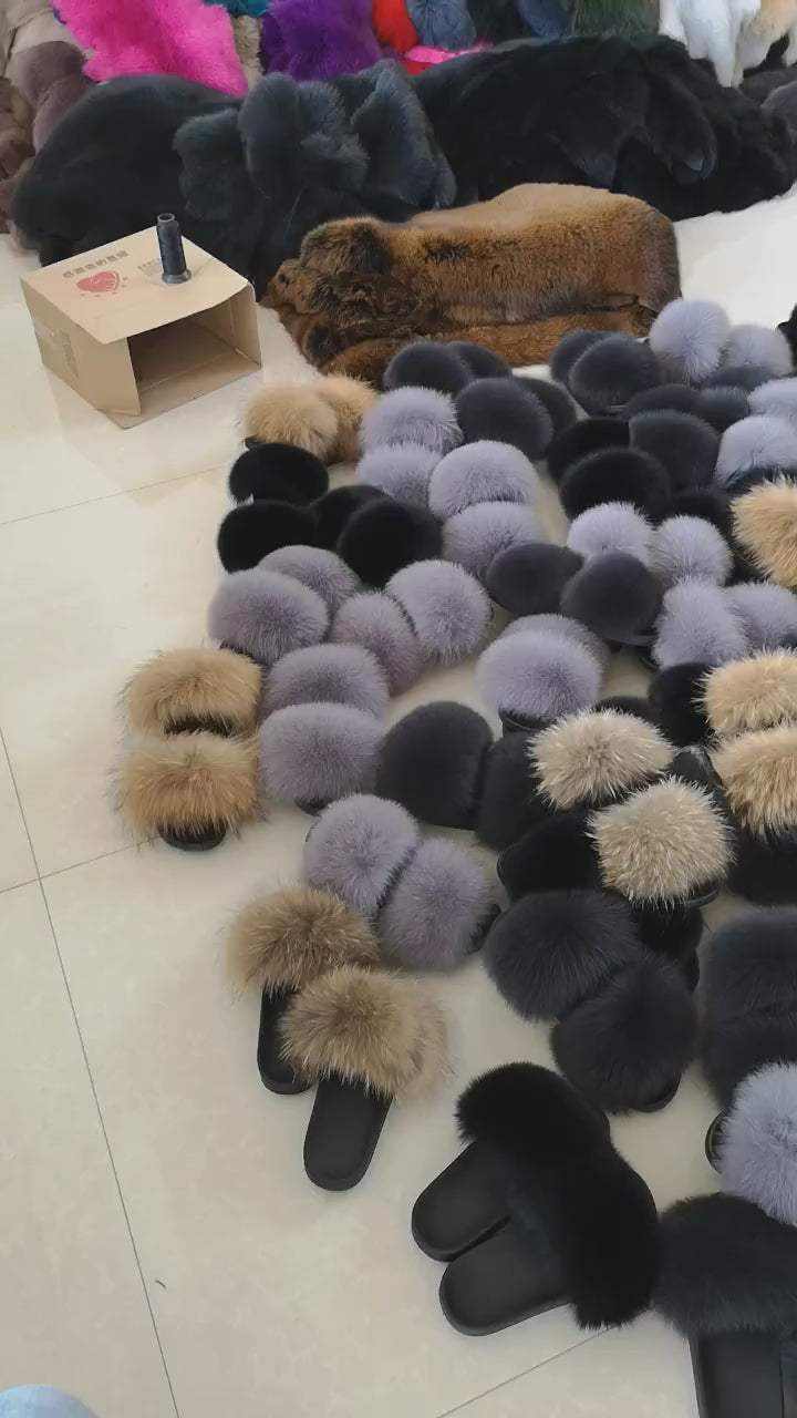 Pantuflas con suela de goma y forro de piel de zorro gruesa. Disponibles en varios colores.
