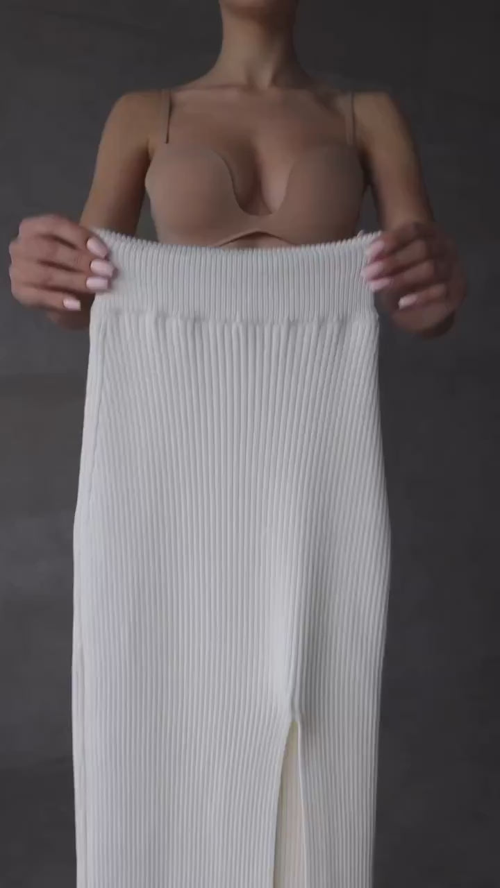 Conjunto de punto compuesto por un top de cuello redondo y una falda larga con abertura, en punto elástico acanalado.