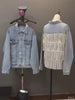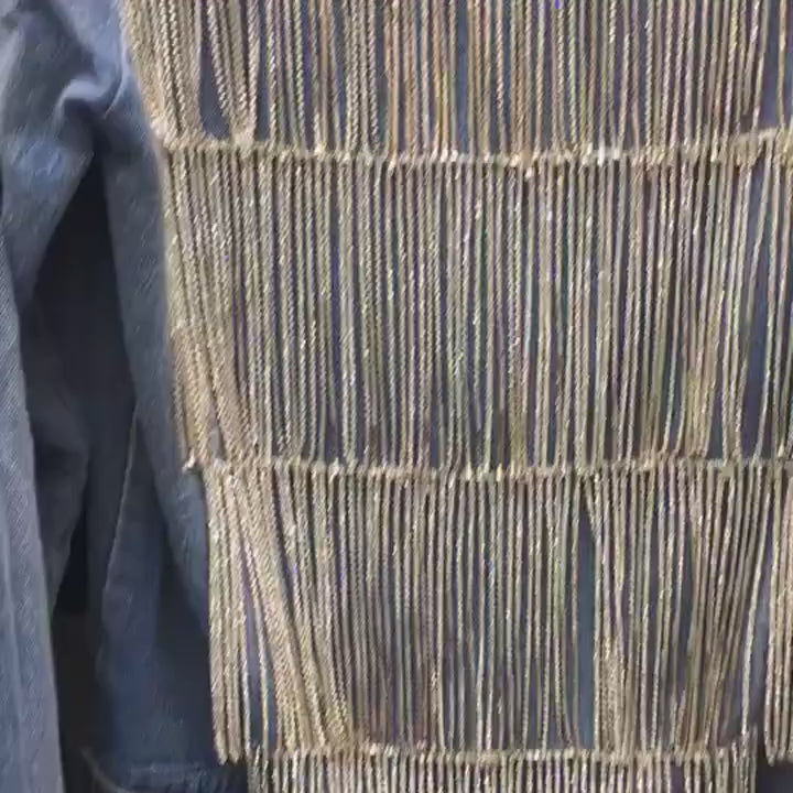 Chaqueta vaquera con bolsillos y espalda completa adornada con flecos de pedrería plateada. Una pieza verdaderamente única y especial. Hecha a medida.