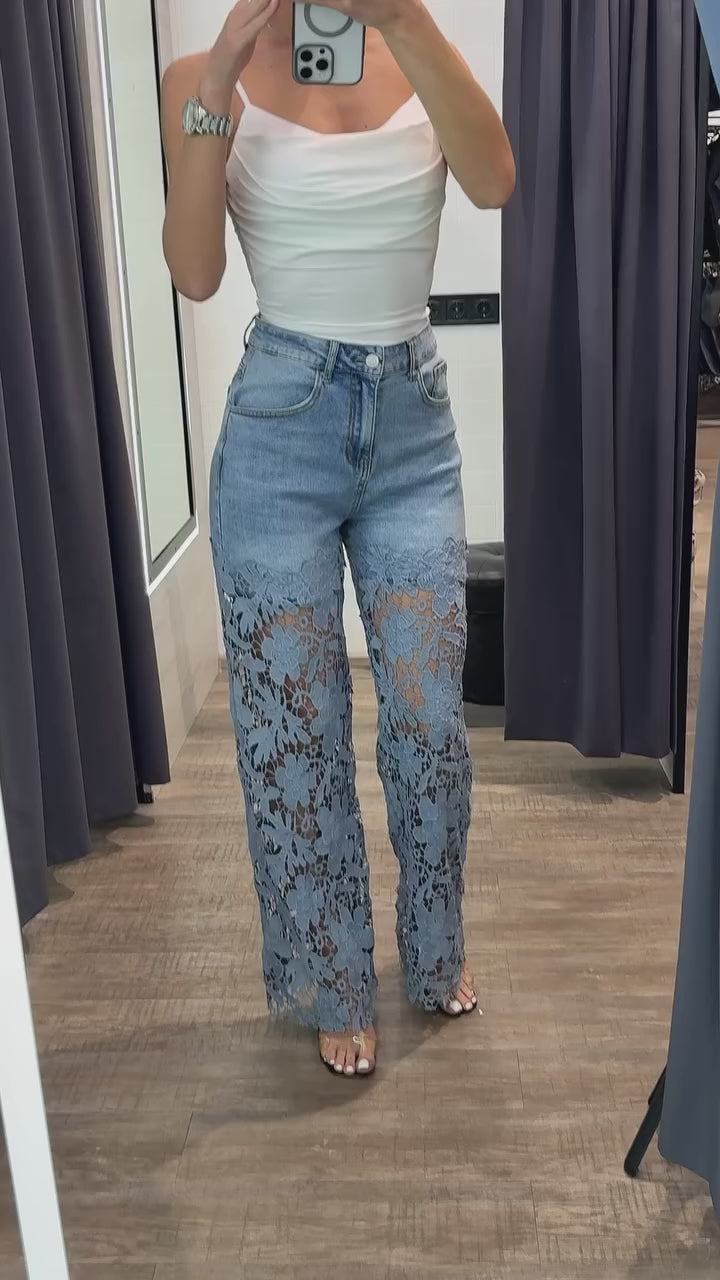 Vaqueros acampanados de talle alto con inserciones de encaje floral: ¡un look vaquero que no pasará desapercibido! Estos vaqueros combinan el encanto del denim clásico con el romanticismo del encaje, con un diseño de pierna ancha y detalles florales transparentes que aportan un toque atrevido y ultrafemenino. Perfectos para quienes se atreven con la moda y transforman un look casual en un icono de estilo.