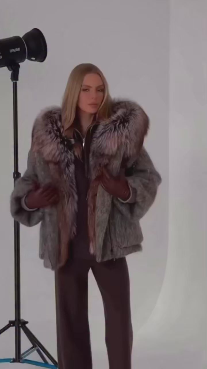 Un capospalla che urla lusso e personalità. Questo giaccone corto in misto lana avvolge la figura con un design sartoriale, vestibilità oversize e un maxi collo in volpe multicolor che cattura la luce a ogni movimento.