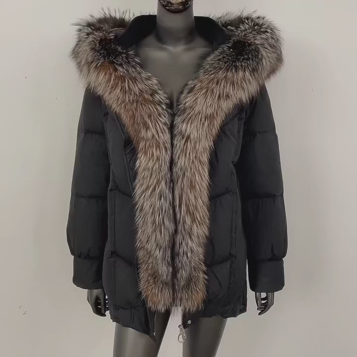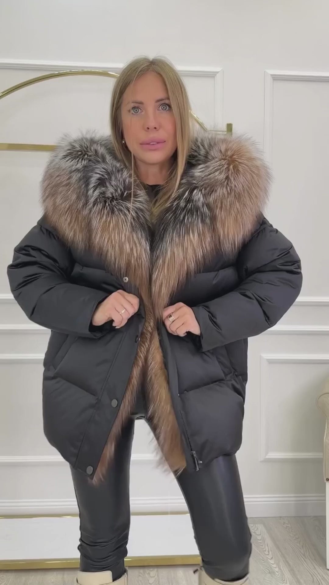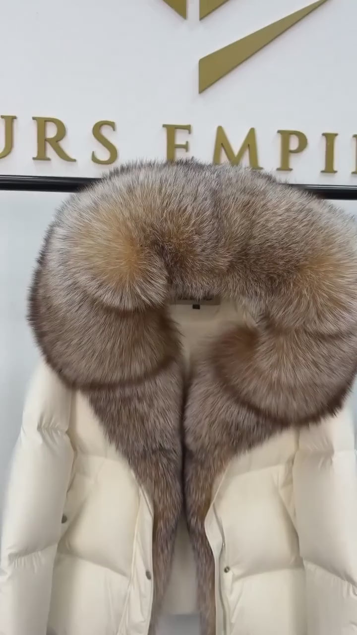 Chaqueta de plumón de ganso auténtico con capucha, bolsillos y cremallera, y un amplio y suave cuello de piel de zorro que se puede quitar de la capucha y enmarca la parte delantera de la chaqueta. Hecha a mano y a medida.
