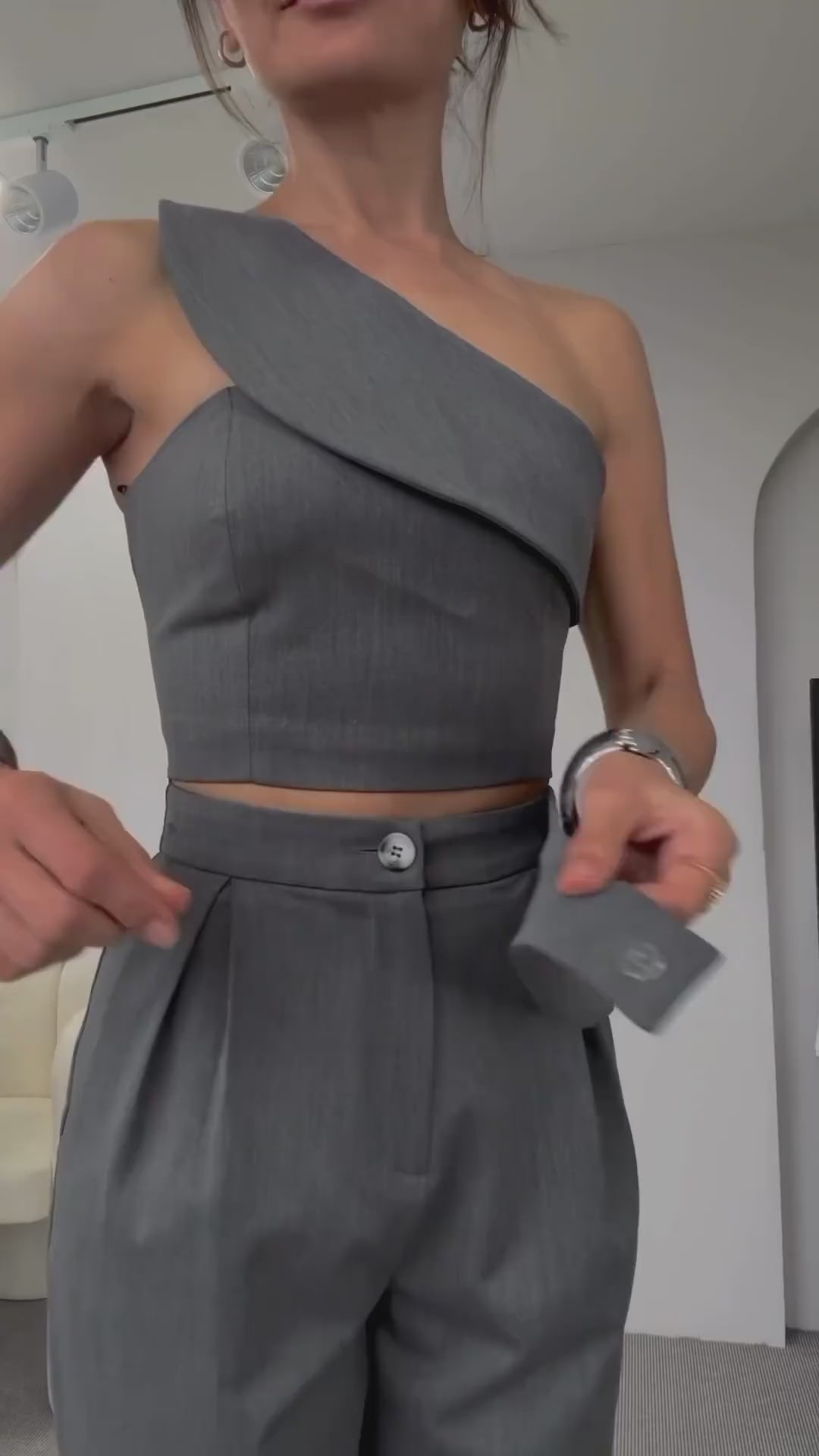 Conjunto de dos piezas: pantalón y top asimétrico. Disponible en gris y negro.