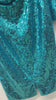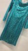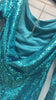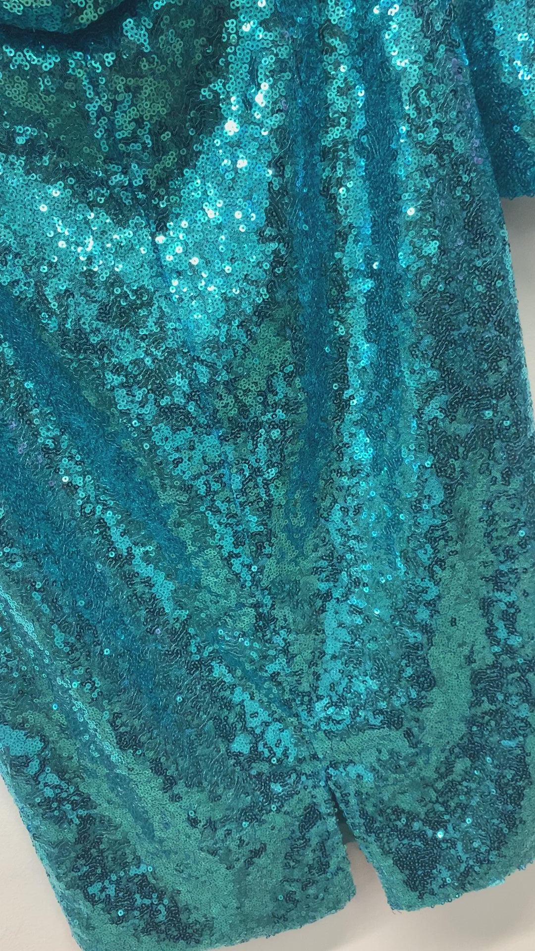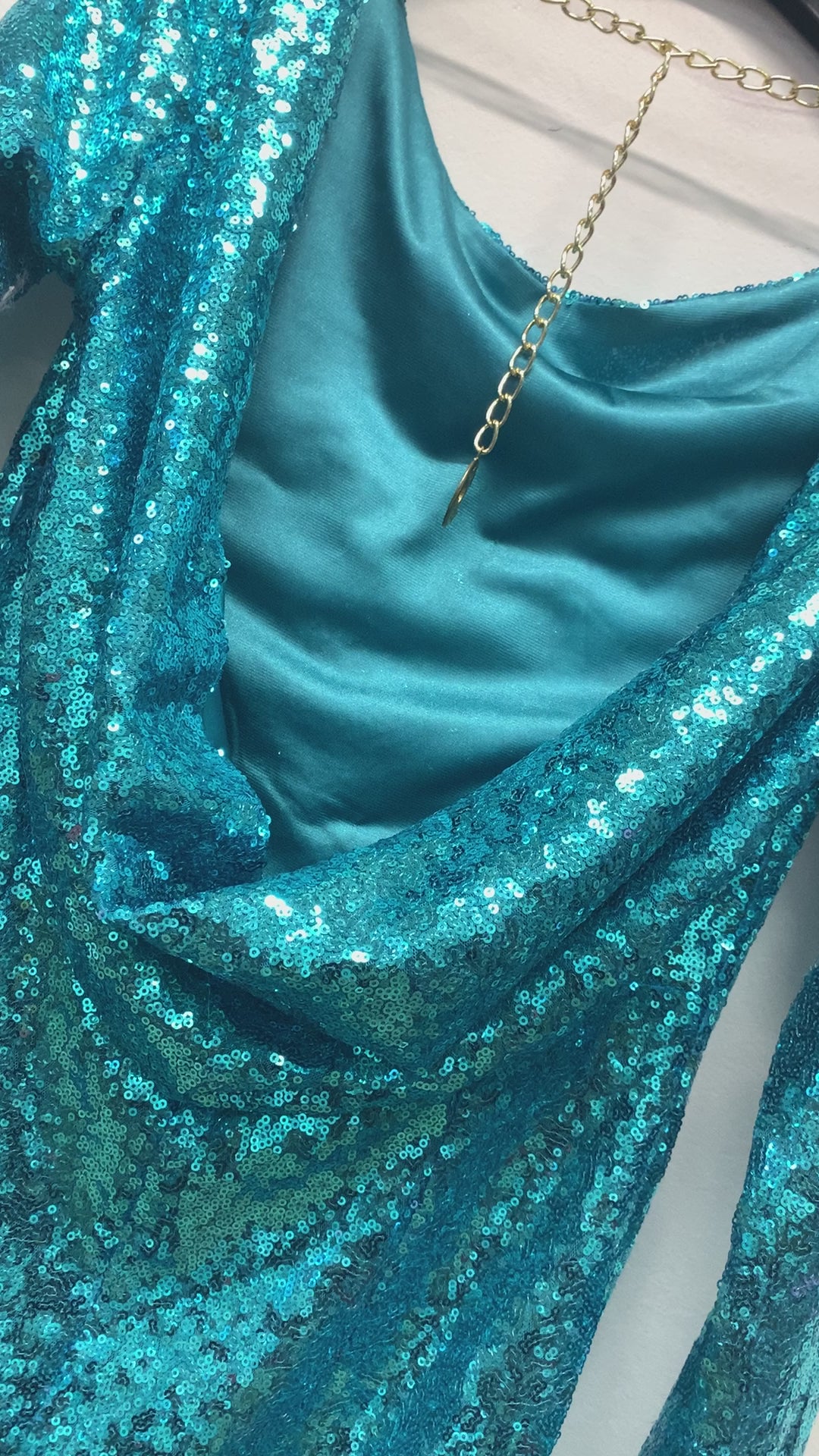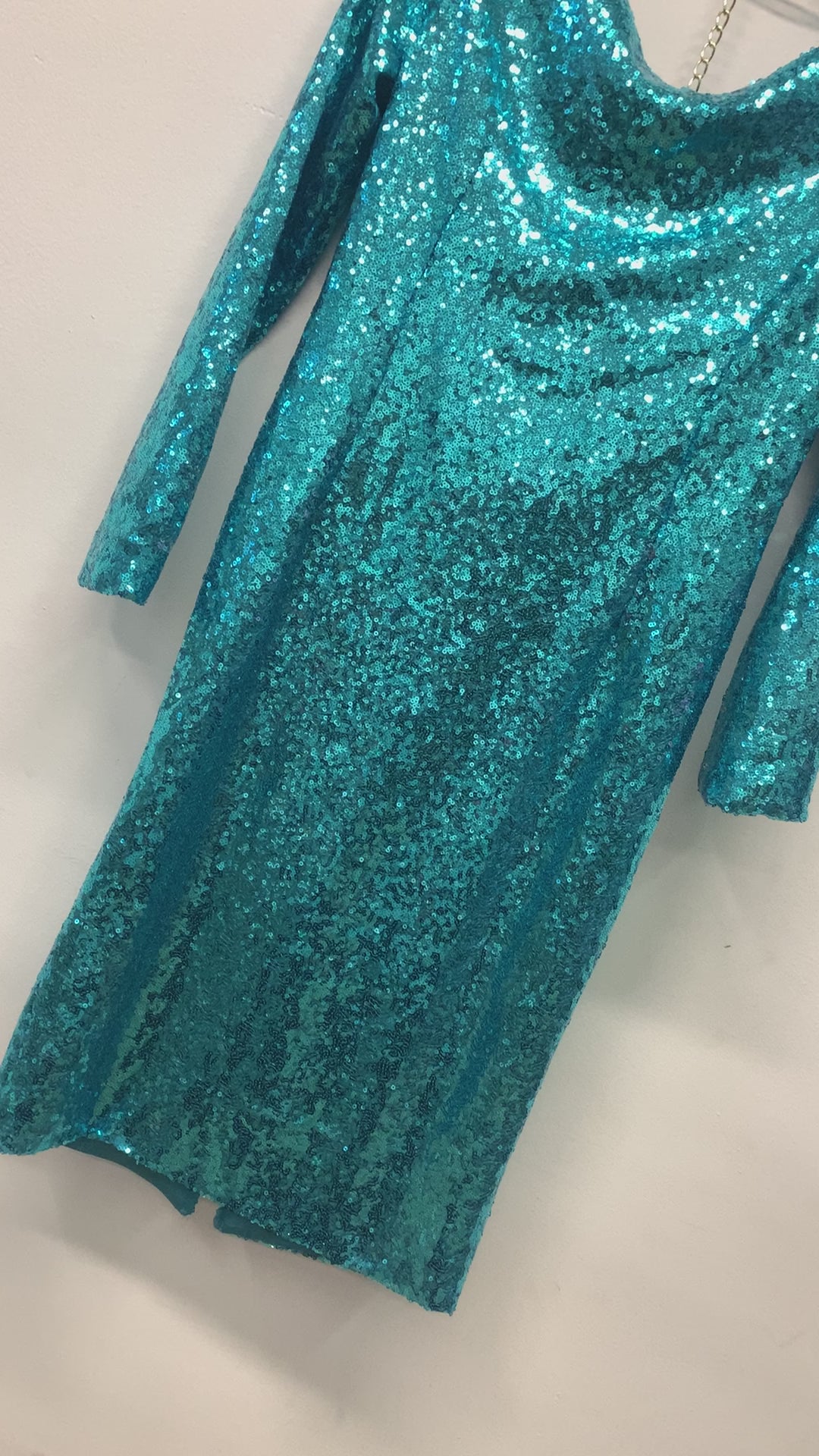 Abito tutto in pailettes colore azzurro costa smeralda, scollo tondo, scollatura sulla schiena morbida e drappeggiata con catenella ornamentale. Ultimo rimasto in superofferta, modello fuori produzione.