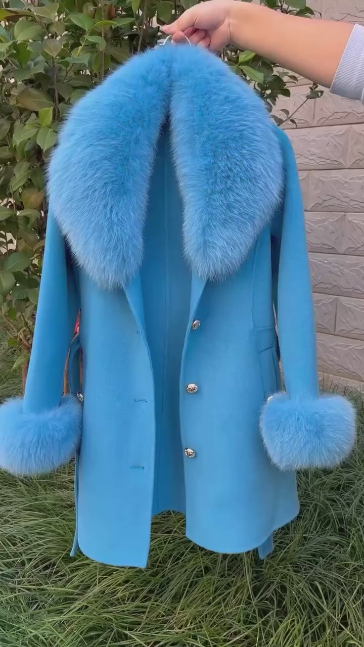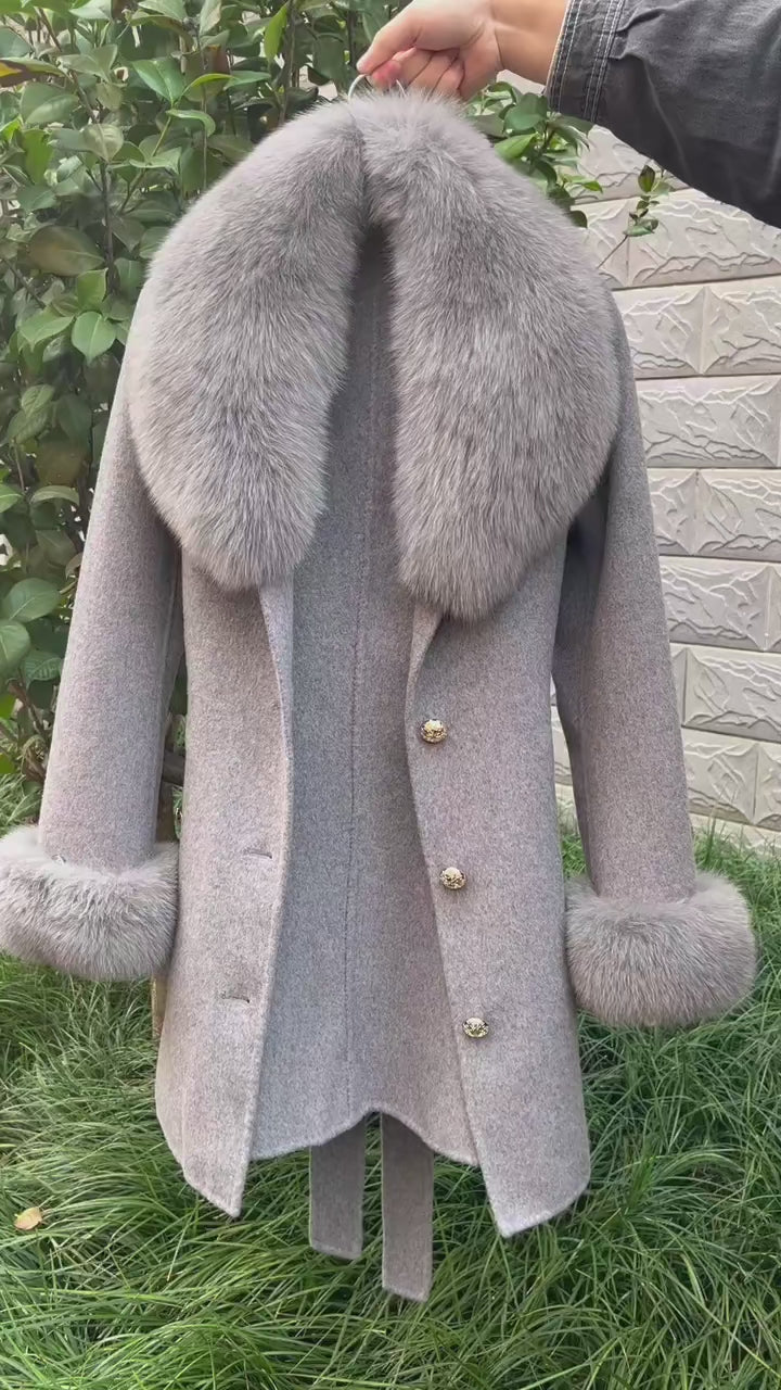 Cappottino in cashmere con maxi collo e polsini in volpe.