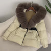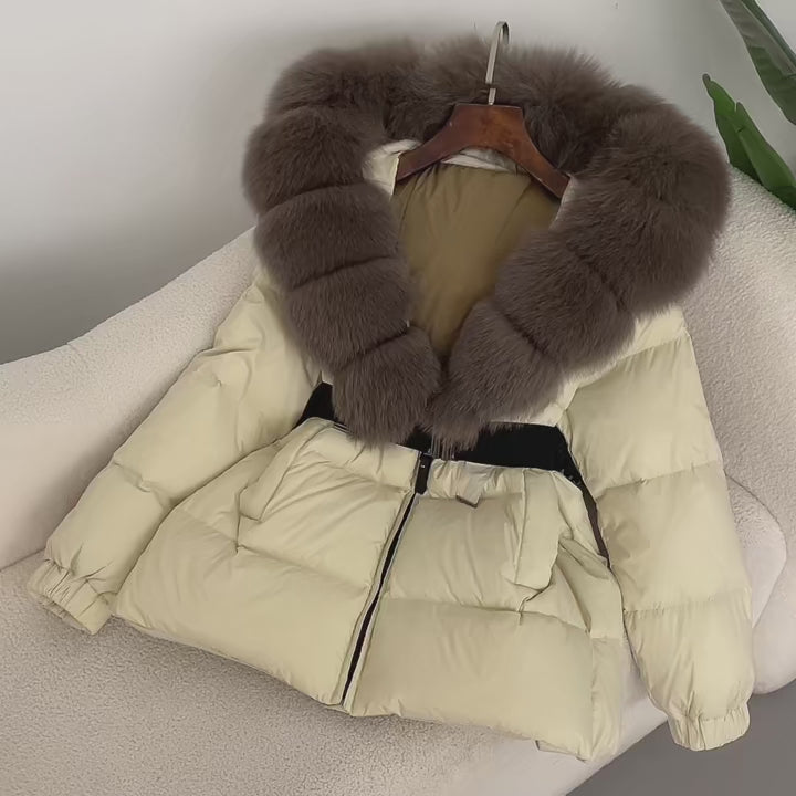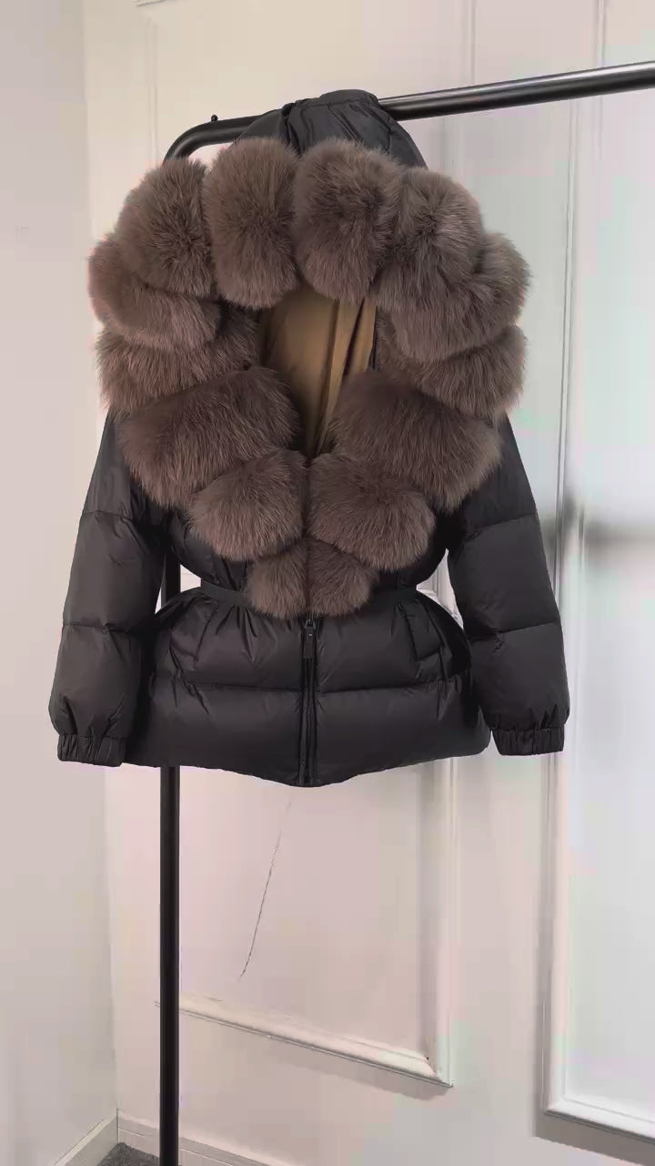 Piumino media lunghezza imbottito in morbida calda e spessa piuma d'oca, modello con cappuccio bordato in vera pelliccia di volpe goffrato. Cintura in vita, tasche zip e polsini elastici lo rendono un capo davvero favoloso!