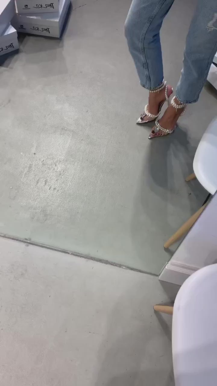 Tacco-gioiello con punta trasparente e grande diamante centrale, cinturino in perle a doppio giro su caviglia. Altezza tacco 8,5 cm.